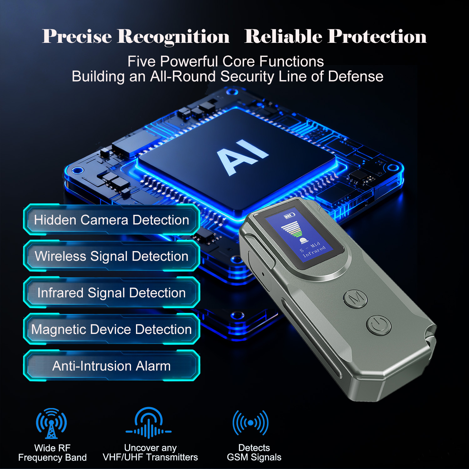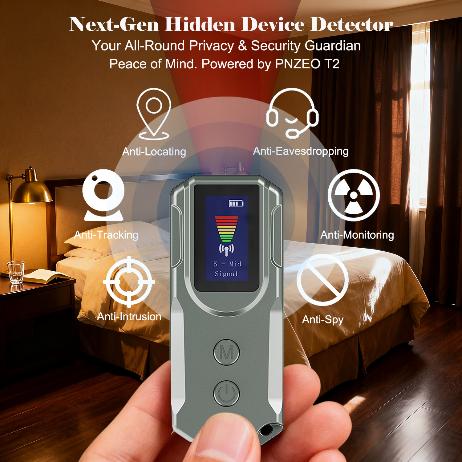 Worried about hidden pinhole cameras when staying in a hotel? Anxious that business negotiations might be wiretapped and confidential information leaked? Want an extra layer of security when living alone? Don't panic! This smart detector, integrating five core functions, is here in a grand launch.
