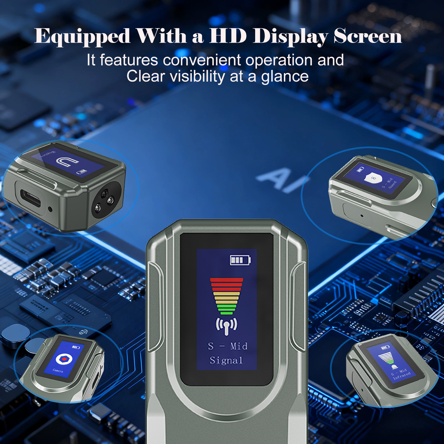 Equipped with a HD IPS display, it clearly presents key information such as signal strength, and mode status. It remains clearly visible even under strong sunlight during the day and is easy to operate in low light at night. Featuring an ultra-simple interactive design, you can switch detection modes with one click. Even the elderly and children can quickly get started, and they can activate security protection without complicated learning.