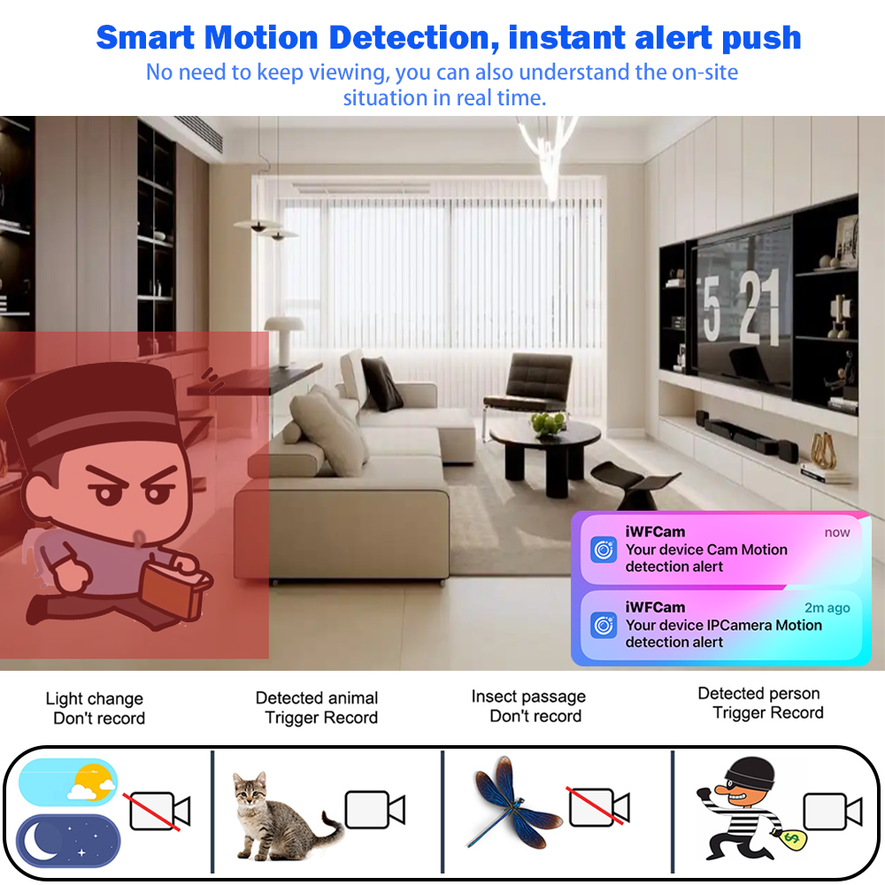 【Smart Motion Detection,Alarm push】Keep in touch with your baby, pets, and family via your phone, wherever you are. This home security camera utilizes smart perceive technology for real-time motion detection alerts, instantly notifying your phone when movement occurs. Simply open the app to quickly review any activity, ensuring you never miss a crucial moment.